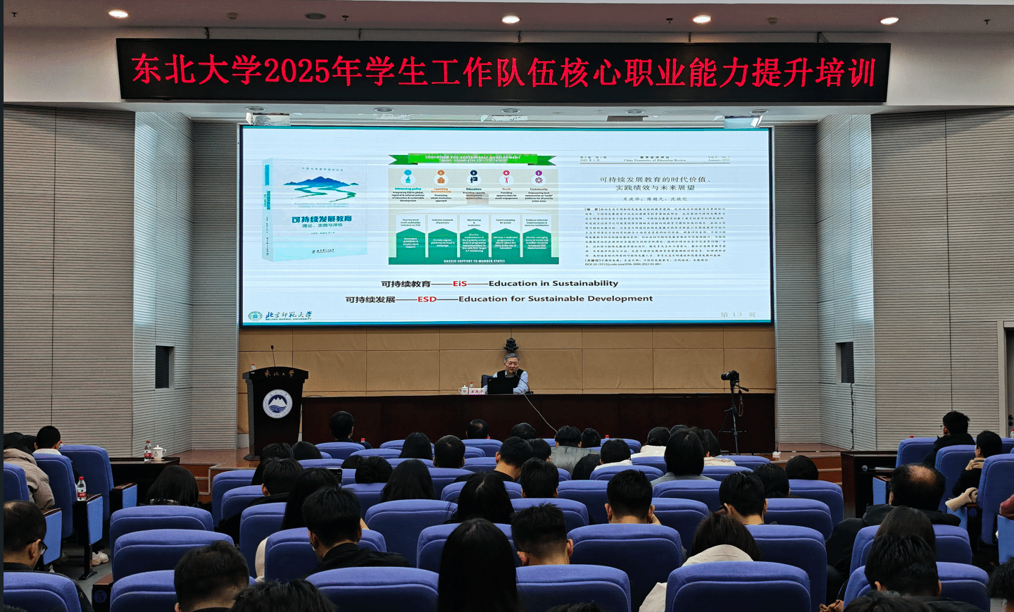关成华以可持续教育理念引领教育创新实践为出发点,结合自身30余年的工作经验,深情展现了一位教育工作者坚守教育初心、探寻教育规律的精神历程,系统梳理了可持续教育思想的形成脉络,帮助学生工作干部建立起可持续教育和未来学习者核心素养框架的清晰认知。关成华强调,要将创新驱动的可持续发展思想深入融入教育领域,着力培养具有全球视野、创新精神、责任担当的时代新人,为学校育人工作提供了宝贵的实践智慧。