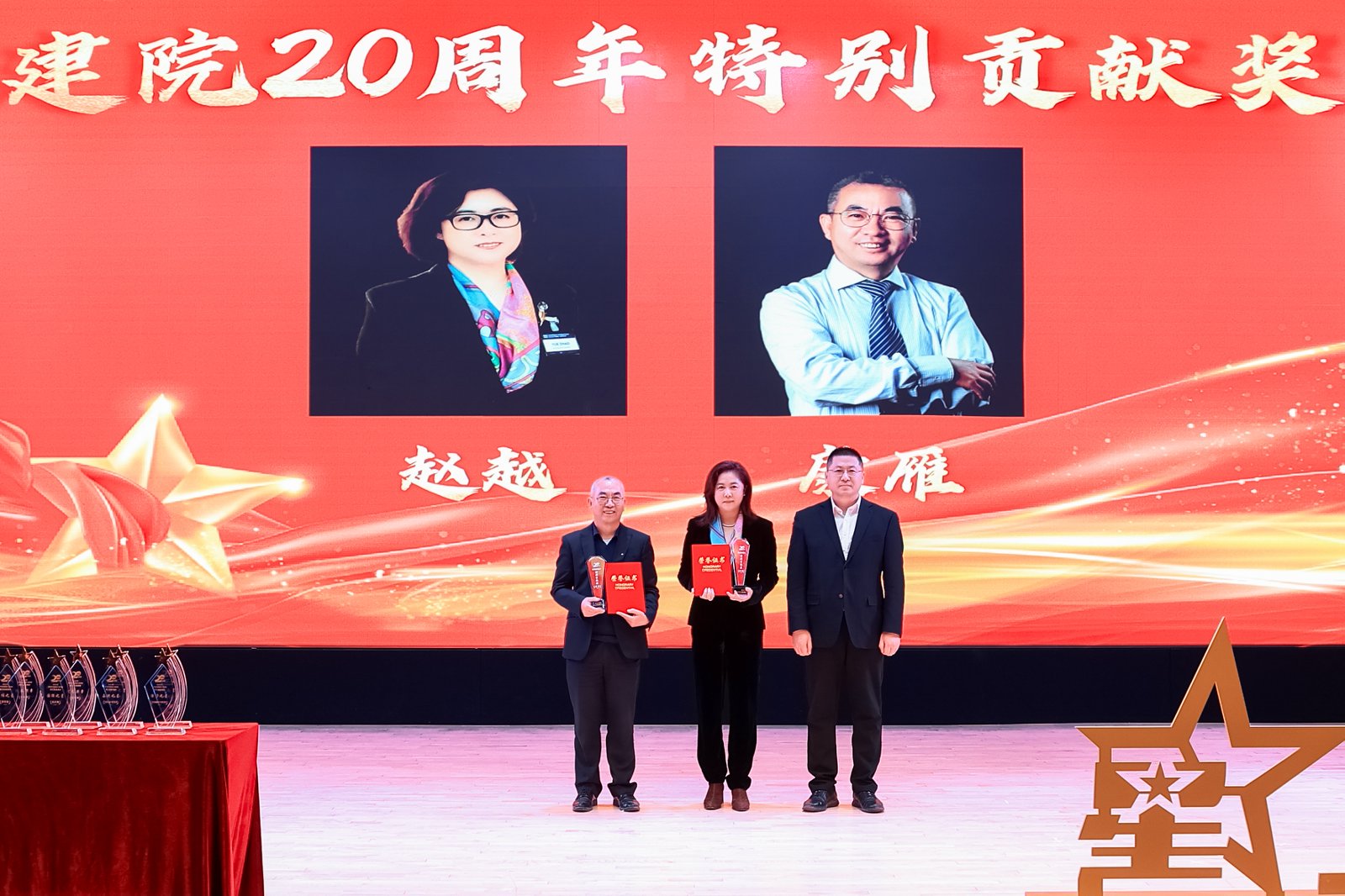 值学院建院20周年之际,为表彰为学院发展作出卓越贡献的先驱者,大会设立“建院20周年特别贡献奖”。吴豪伟为获奖的赵越教授、康雁教授颁奖。