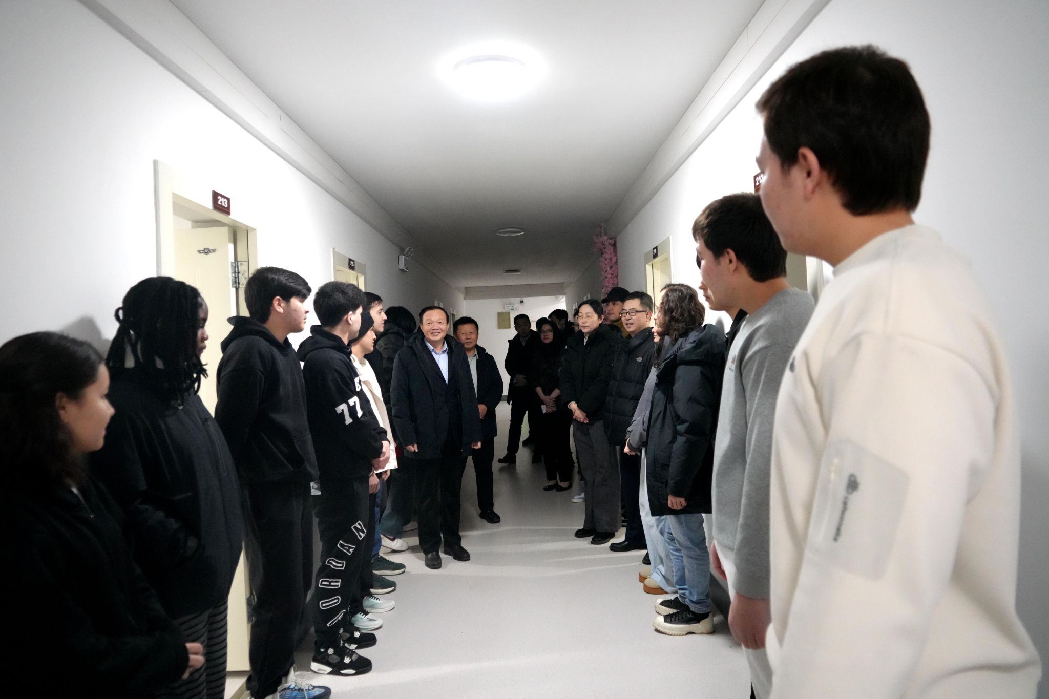 郭海、王辉走访慰问了学生宿舍,看望了留校学生与留学生代表,深入了解了学生寒假留校的学习和生活状况,详细询问了宿舍生活设施的配备情况,为同学们送上新春祝福和暖心礼包,叮嘱同学们合理安排好学习和生活,度过一个安全、充实的假期。