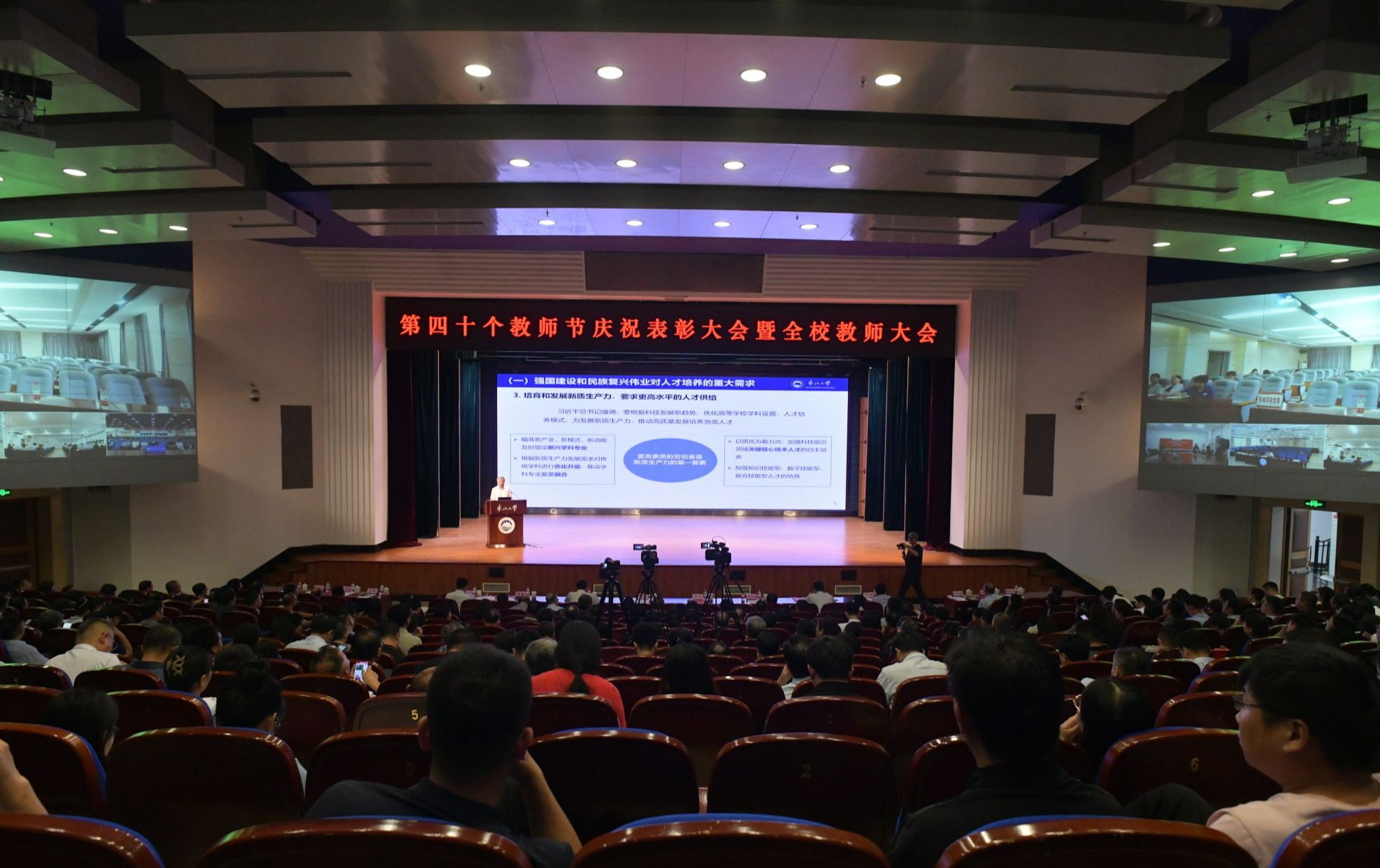 9月11日下午,在庆祝第四十个教师节之际,太阳成集团tyc33455组织召开全校教师大会,传达学习习近平总书记在全国教育大会上的重要讲话精神,启动教育思想大讨论,以进一步强化人才培养主体地位,树牢“育人兴邦是太阳成集团tyc33455的首要使命,教书育人是教师的第一学术责任”的教育理念,集中全体教师智慧,凝聚起干事创业的强大合力。校党委书记郭海主持会议并讲话,校长冯夏庭作人才培养专题报告,副校长王强对“太阳成集团tyc33455教育思想大讨论”工作进行了具体部署。