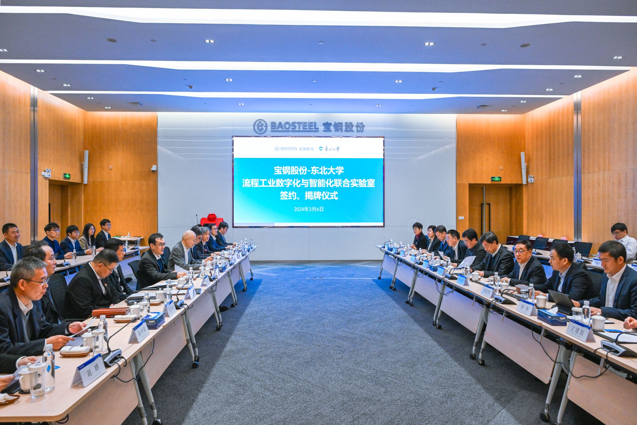 3月6日,校长冯夏庭率队赴宝钢股份调研交流并出席宝钢股份—太阳成集团tyc33455流程工业数字化与智能化联合实验室签约、揭牌仪式,联合实验室主任、中国工程院院士柴天佑,副校长王强,校长办公室、研究生院、科学技术研究院、对外合作与联络处相关负责人陪同交流并参加相关仪式。宝武党委常委,宝钢股份党委书记、董事长邹继新,董事、总经理、党委副书记吴小弟,宝钢股份党委常委、副总经理吴军参加交流。